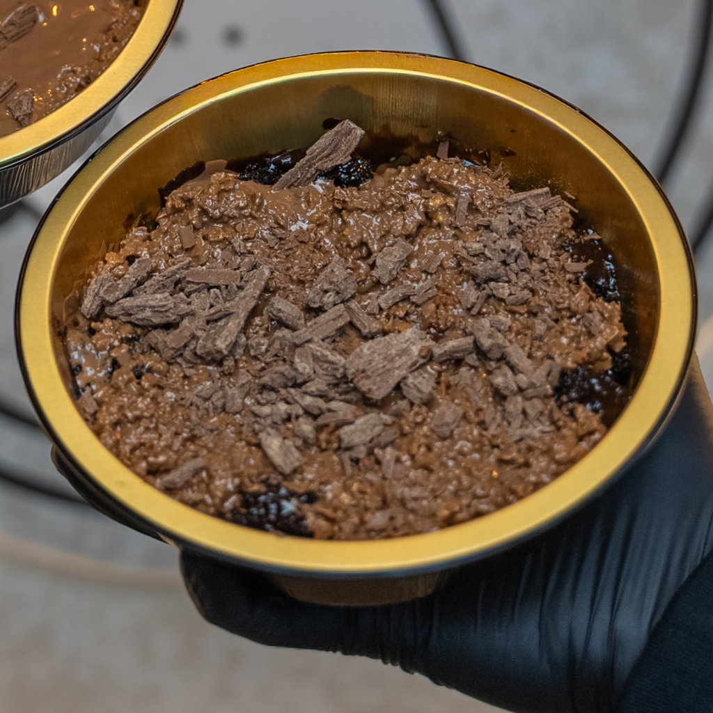 Our In-House Molten cake topped with our own style of Kinder Krunch, Kinder sauce and Flake.